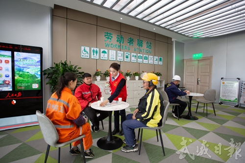 5月23日,户外工作者在劳动者驿站休息歇脚。市政府政务服务中心设立劳动者驿站 ,为快递员、外卖员、环卫工人等户外工作者提供贴心周到的歇脚服务。(记者甘曜毓 )